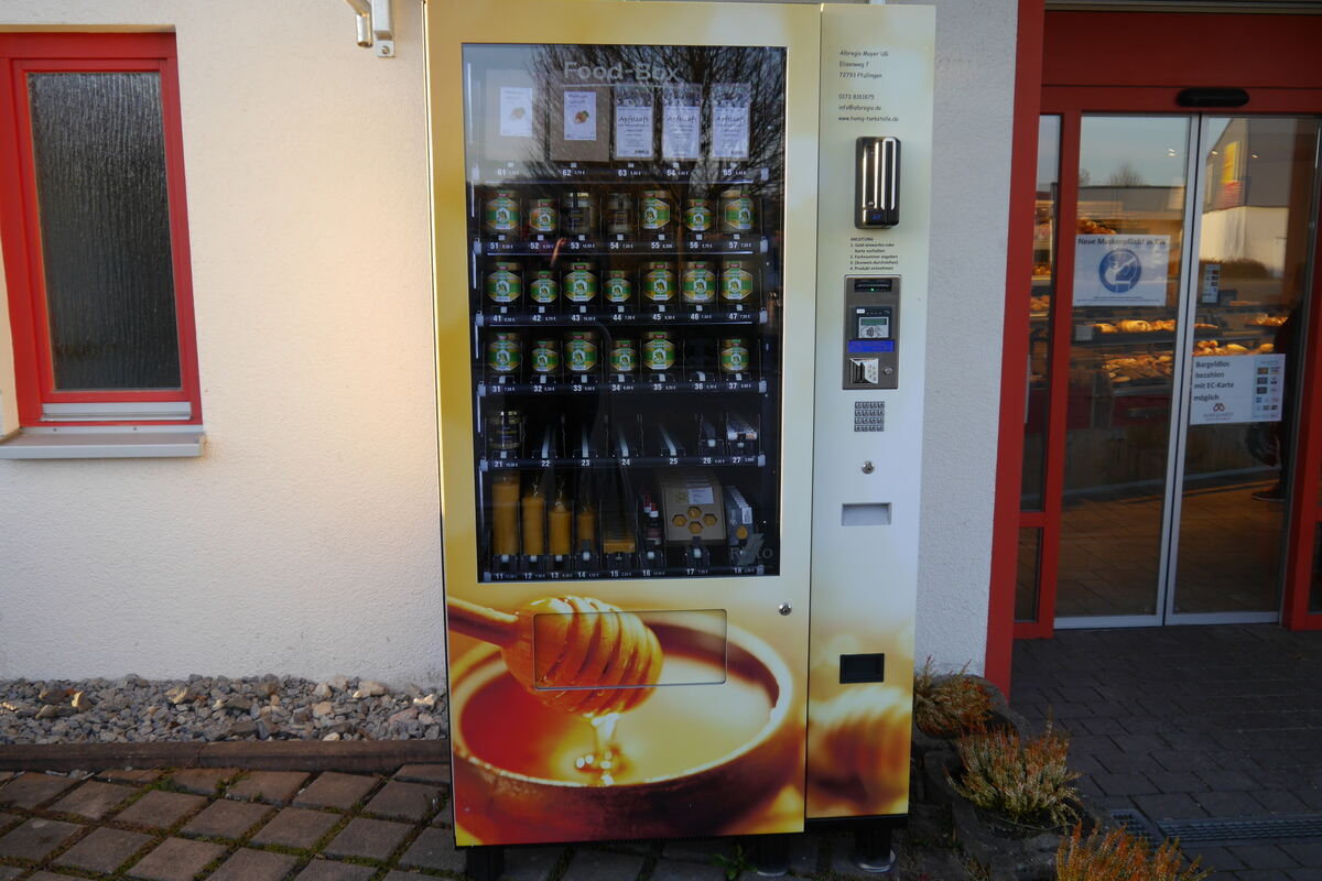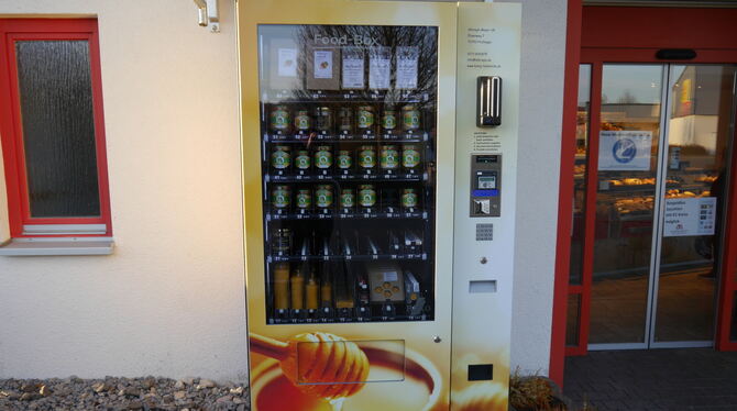 PFULLINGEN/ENGSTINGEN. Seit 16 Jahren betreibt der Pfullinger Karlheinz Mayer eine kleine Imkerei im Nebenerwerb. Seine Bienenvölker stehen auf Streuobstwiesen im Biosphärengebiet Schwäbische Alb. Mittlerweile bewirtschaftet Mayer 42 Bienenvölker und rund 100 Obstbäume. Bisher hat er seine Honigprodukte an der Haustür, über einen Online-Verkaufsshop und einen Verkaufsautomaten in Pfullingen vertrieben. Da seine Produkte sehr beliebt sind, hat der Imker dieses Jahr seinen Vertrieb erweitert und verkauft seine Erzeugnisse nun auch in Engstingen. Die Anschaffung und Aufstellung eines Verkaufsautomaten mit »Honigprodukten to go« wurde mit Fördergeldern aus dem Regionalbudget von Leader Mittlere Alb unterstützt.
