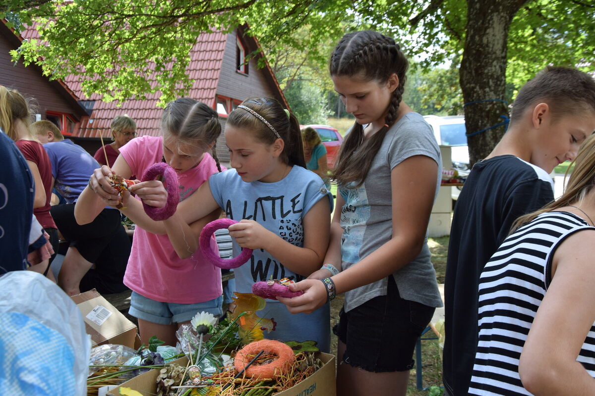 Die Kinder suchen sich Material zum Basteln von Türkränzen aus.
