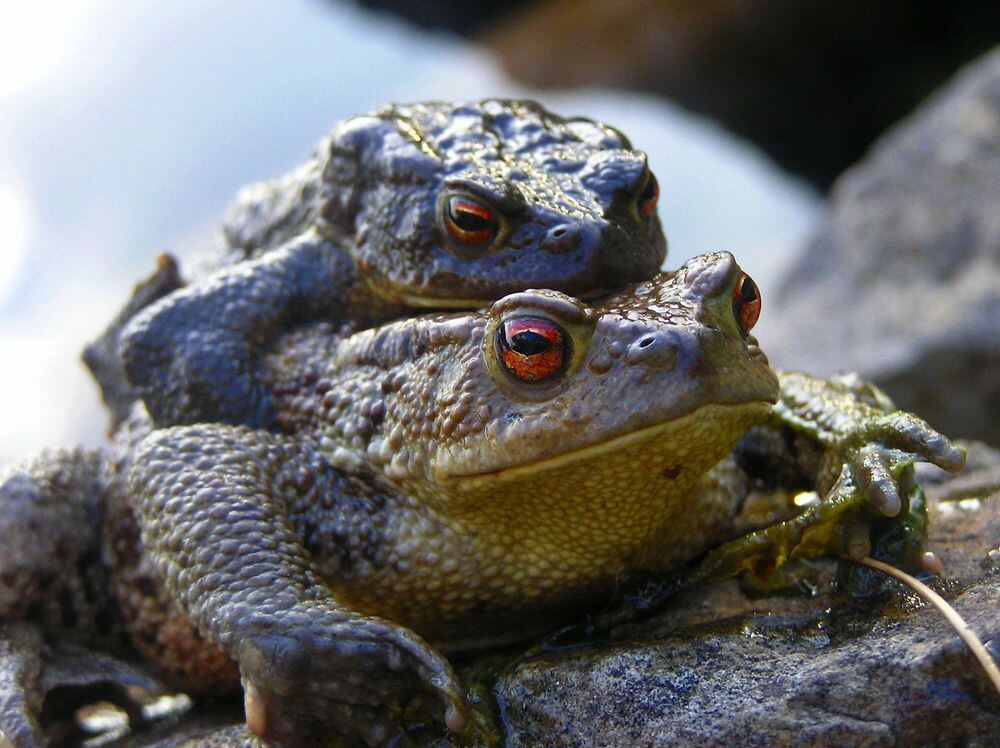 Achtung Krötentransport. Ein Erdkötenweibchen hat sein Männchen bereits Huckepack genommen, um es zum Laichgewässer zu tragen. Wie lange die Krötenwanderung dauern wird, ist wetterabhängig sagen die Experten. FOTO: HEIKE SCHMID-SCHEUB
