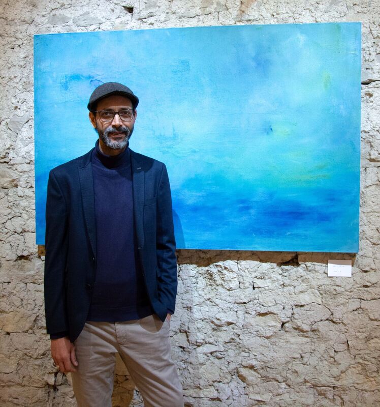 Simone Haug zitierte in ihrer Eröffnungsrede die Reisende und Literatin Isabelle Eberhardt und ihre malende Beschreibung der Wüste Nordafrikas, doch diese braucht es nicht, um in die Bilder von Imed Ben Tahal einzutauchen. Alle strahlen sie Ruhe und Weite aus. Die raue Schraffur pastelliger Farben lässt an Wüstensand denken und aufgebrochene Erde. Andere Bilder wecken Assoziationen an das leuchtende Blau des Meeres oder des Himmels. Und tatsächlich findet man in ihnen auch diesen Moment, wenn sich die Sonne langsam neigt, gelblich warmes Licht über der Landschaft liegt und am Himmel wunderbare Farbspiele entstehen – rosarot, hellblau, türkis, diese sanften Himmelsgemälde, die ihren ganz besonderen Zauber haben und die man in Tunesien findet und auch auf der Schwäbischen Alb.