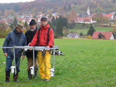 Klaus Besch und sein Bruder Heinz Besch, Mitte, weichen Johannes Heinzel nicht von der Seite, während der mit dem 19 Kilogramm schweren Caesium-Magnetometer oberhalb Gomadingens auf Spurensuche nach dem vermuteten Römerkastell geht.