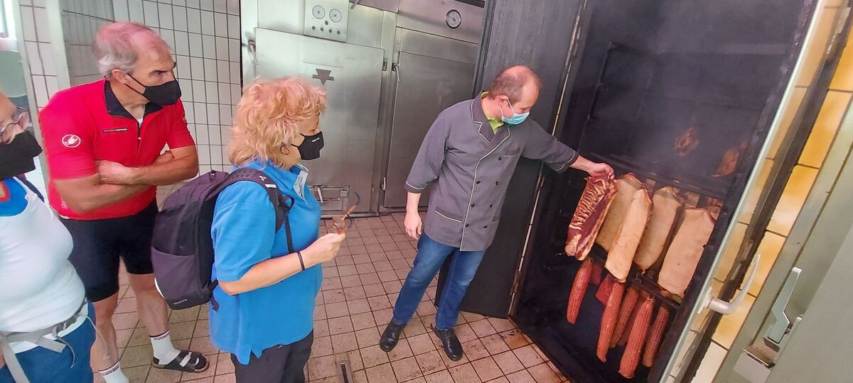 Die grüne Bundestagsabgeordnete Beate Müller-Gemmeke (Mitte) macht auf ihrer Albtour Station in der Metzgerei von Marco Allmendinger (rechts) in Undingen.