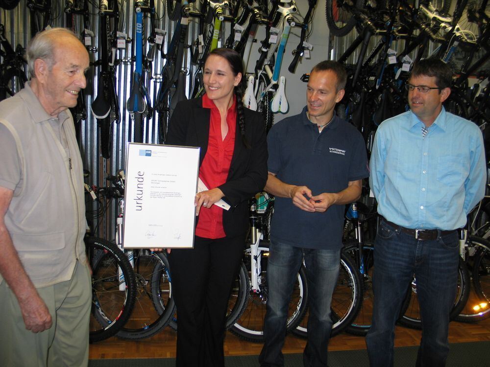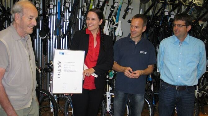 Firmengründer Helmut Schneiderhan (links) freut sich über die IHK-Urkunde, die Marijana Tomin heute ihm sowie Jürgen Schwald und Martin Schneiderhan, rechts, ausgehändigt hat. Foto: Oelkuch
