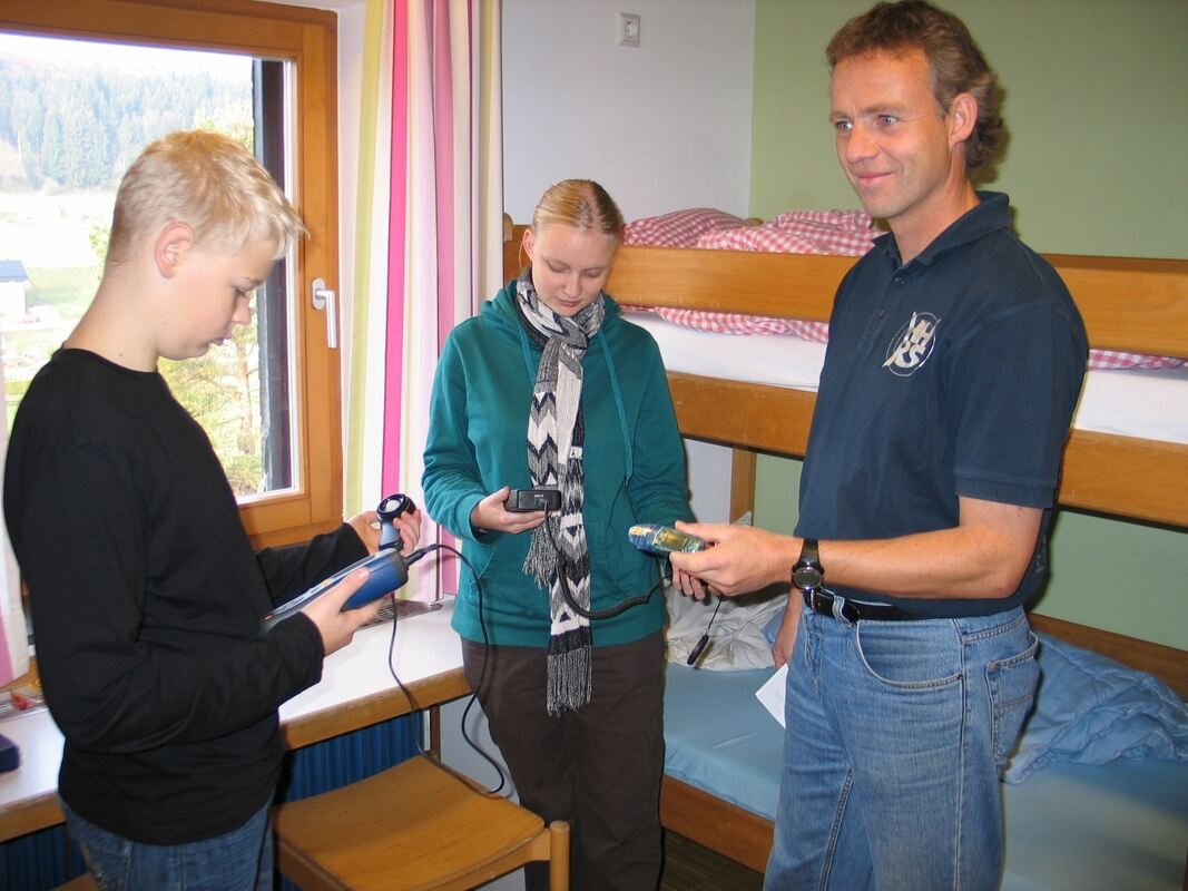 Niclas, 13, Sofia Herzenberger, die im Waldschulheim ihr Freiwilliges Ökologisches Jahr absolviert, sowie Peter Tobies, Lehrer an der Hermann-Hesse-Realschule Reutlingen, messen in einem der Schlafräume in Indelhausen Helligkeit und Temperatur.