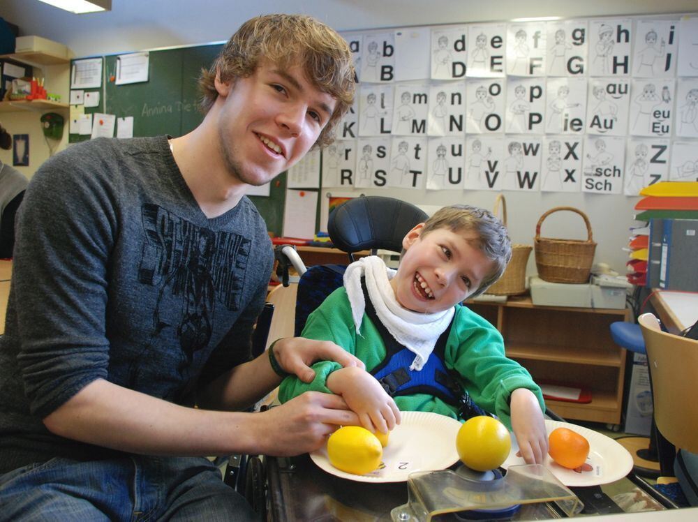 Florian Eckardt (19) macht ein Freiwilliges Soziales Jahr in der Mariaberger Sonderschule und bringt Pierre Seidel (10) bei, Orangen von Zitronen zu unterscheiden.