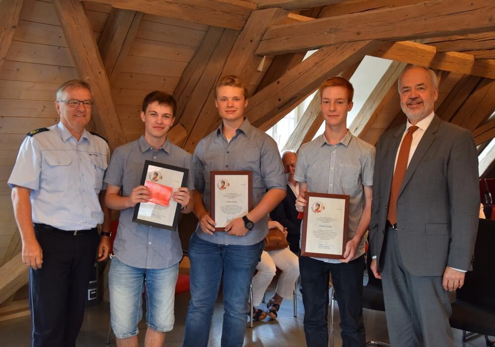 Junge Leute mit Zivilcourage: Die Pliezhäuser (v. l.) Patrick Zimmermann, Fabian Geiger und Lennart Große wurden vom Förderverein Kriminal- und Verkehrsprävention ausgezeichnet (links Polizeipräsident Hans-Dieter Wagner, rechts Landrat Thomas Reumann).