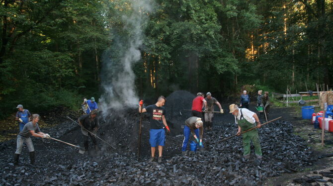 Mit vereinten Kräften und Freiwilligen aus drei Generationen: Köhler Georg Geiselhart (rechts) und seine Helfer am Meiler bei Münzdorf. FOTO: THUMM