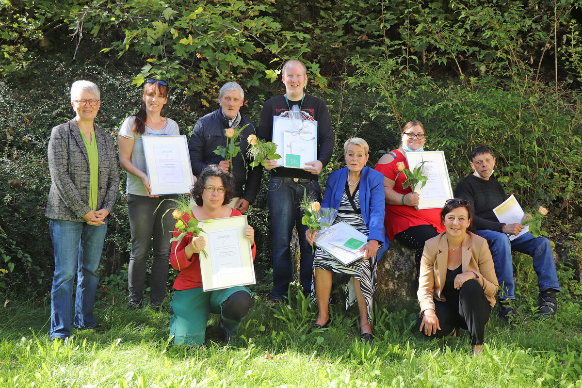 Mit Lyrik und Malerei haben Künstler des Living Museum der Bruderhaus-Diakonie Buttenhausen Preise gewonnen: Angelika Janssen (von links) und Regina Hintzenstern (Begleiterinnen), Claudia D., Dieter Döpping, Tobias Krebs, Andrea Piontek, Saskia Czepluch, Kunsttherapeutin Sarah Boger und Josef Wicker.