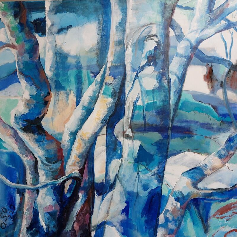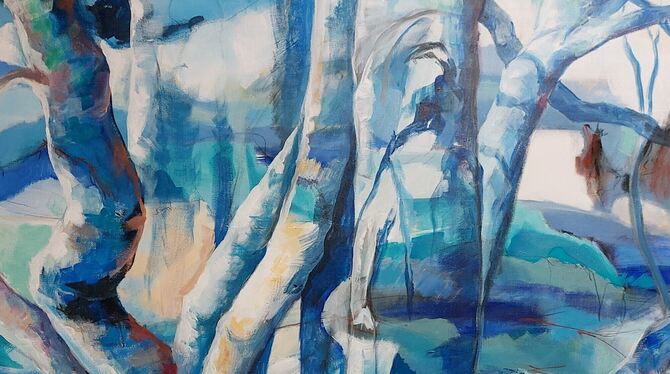 Beim Wandern über die Alb ist Bettina Casabianca immer wieder beeindruckt von der abwechslungsreichen Landschaft, aber ganz besonders von den alten Baumriesen – den verschlungenen Buchengruppen, den knorrigen Kiefern und uralten Eichen. Aus diesem Grund trägt die Künstlerin stets ein Skizzenbuch bei sich, um diese Motive zeichnerisch festzuhalten. Daraus entwickeln sich ihre teils großformatigen Acrylbilder, wobei ihre eigene Interpretation eine neue Farbigkeit schafft.