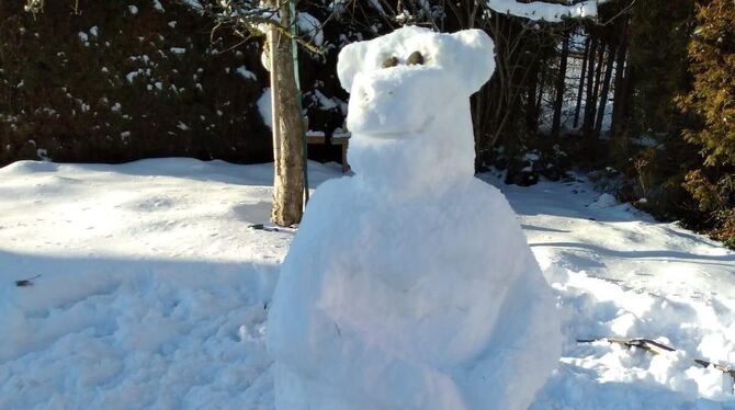 Trotz des vielen Schnees und des kalten Winters hält dieser Schneebär keinen Winterschlaf! Die Jungschar in Genkingen forderte ihre Kinder auf, zu Hause lustige Figuren aus Schnee zu bauen. So kam dieser tolle Bär zustande. Falls auch ihr witzige Schneebilder habt, sendet sie uns gerne zu! (lahu)