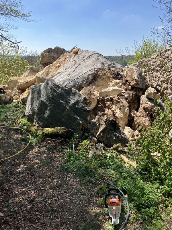 Nach Vorlage der Genehmigungen wurden am Dienstag, 22. April, die Arbeiten zur Felssicherung unter strengen Auflagen aufgenommen. Nachdem der Nadelfels mittels Seilwinden in den Burghof niedergelegt werden konnte, folgte die Übersteigung und Beräumung von weiteren akut absturzgefährdeten Felsformationen. Dass durch die Felsen eine Gefährdung für die Verkehrssicherheit bestand, hat sich bei der Niederlegung des Nadelfelsens und auch bei der Übersteigung bestätigt. Insgesamt wurden etwa 20 Tonnen Gesteinsmaterial, die bis zur Kreisstraße gelangten, beseitigt.