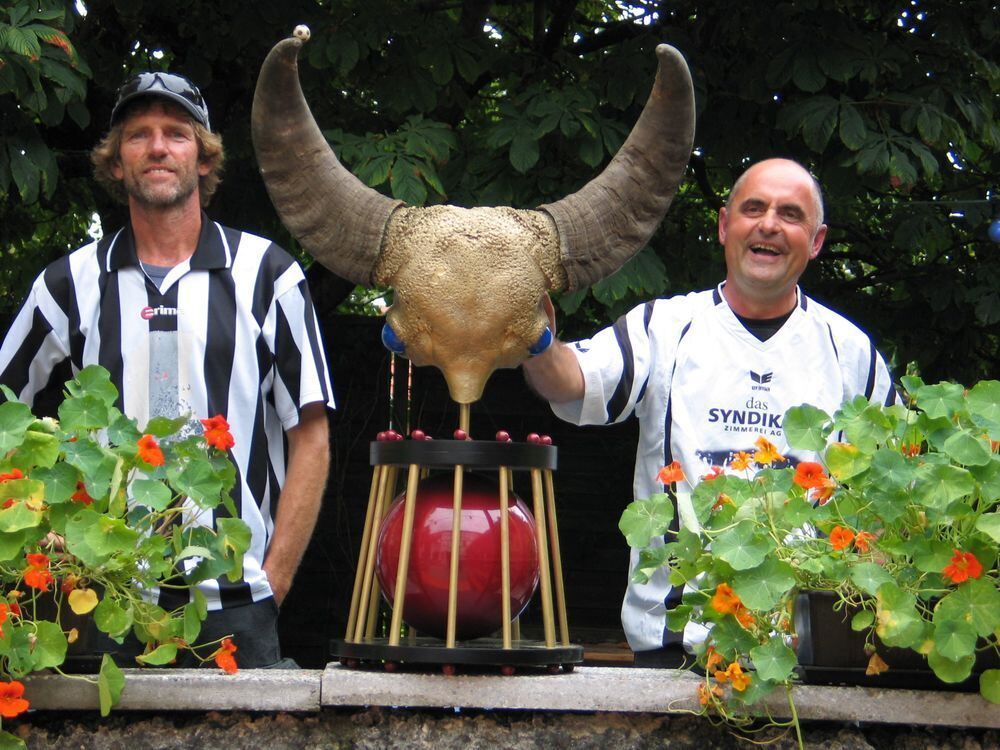 Jörg Wiedemann aus Gomaringen, links, und Jürgen Zimmerer, Lichtenstein, mit dem neuen Kickfest-Pokal. GEA-FOTO: OELKUCH