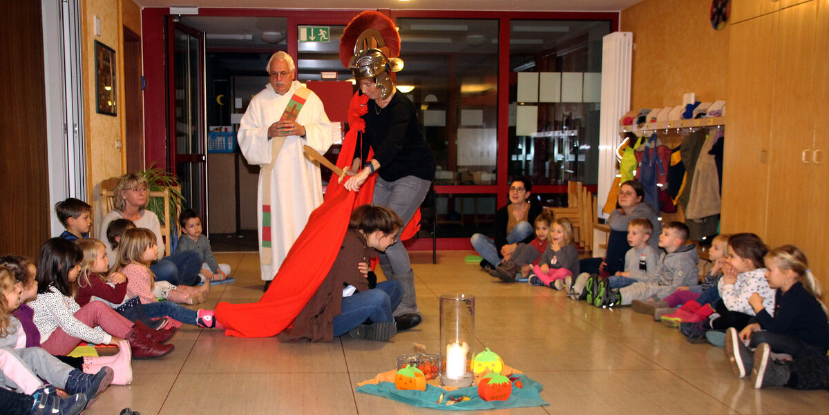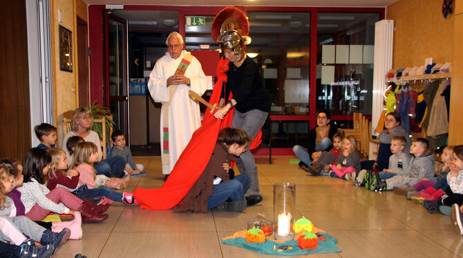 Kleines Fest zu St. Martin: Erzieherinnen des katholischen Kindergartens Großengstingen und Diakon Rudolf Tress inszenierten die Martins-Legende. FOTO: LEIPPERT