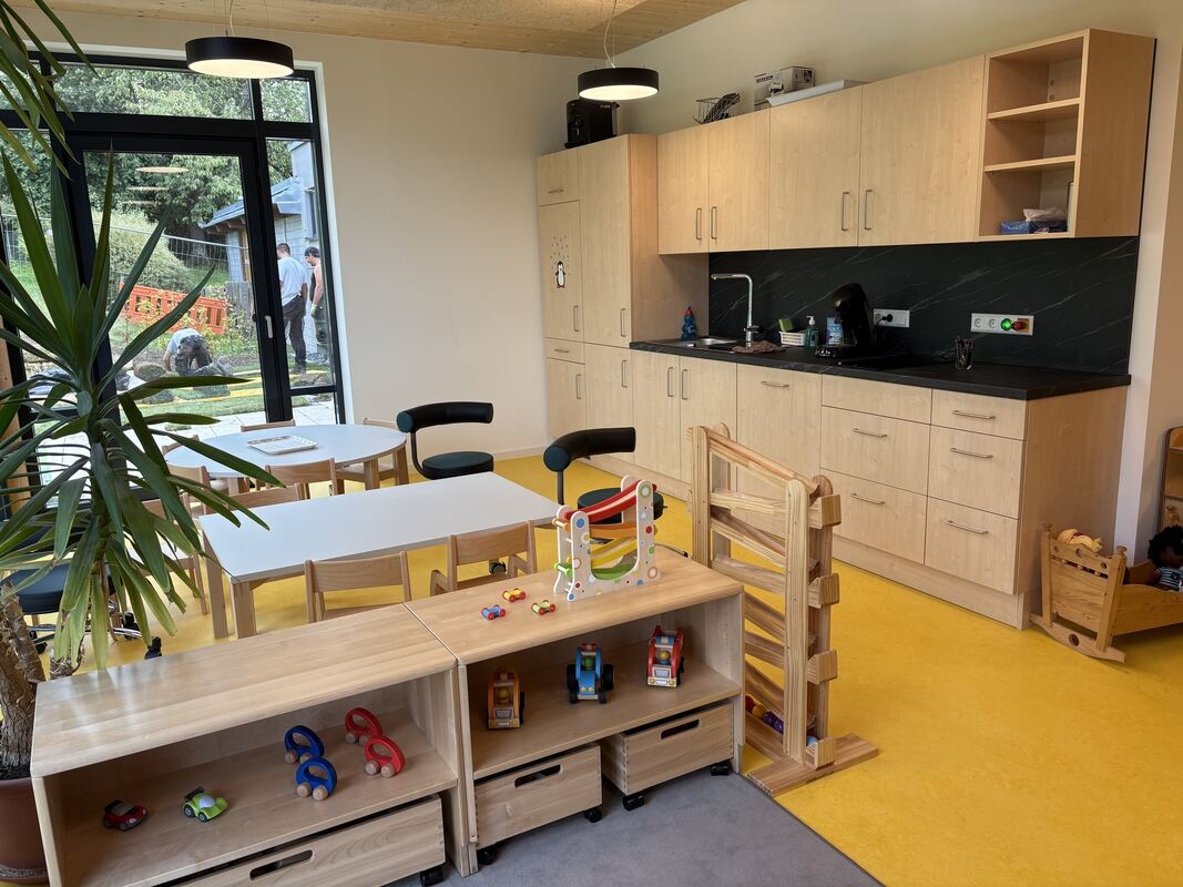 Dank der Erweiterung gibt es nun insgesamt mehr Platz: durch einen dritten Pavillon für weitere 25 Kinder ab drei Jahre, sowie durch ein Flachdachgebäude im hinteren Bereich für eine zusätzliche Gruppe mit zehn Kindern unter drei Jahre. Außerdem konnten dadurch weitere Sozialräume samt Mensa geschaffen werden. Und dies alles unter den aufmerksamen Augen der Kinder, die den Baufortschritt Tag für Tag gespannt mitverfolgten: »Sie versorgten Handwerker mit Kaffee und Süßis und durften mitentscheiden. Kinder und Erzieherinnen haben während der ganzen Zeit viel Staub, Lärm und Chaos in Kauf genommen«, blickte Helbing zurück.