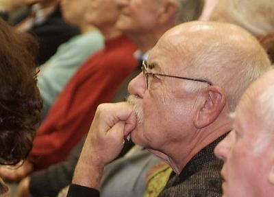 Klaus-Peter Kleiner in nachdenklicher Pose (als Zuhörer beim GEA-Wahlpodium zur Bürgermeisterwahl in Sonnenbühl): Im Oktober tritt Engstingens Bürgermeister nach drei Wahlperioden selbst noch einmal an.