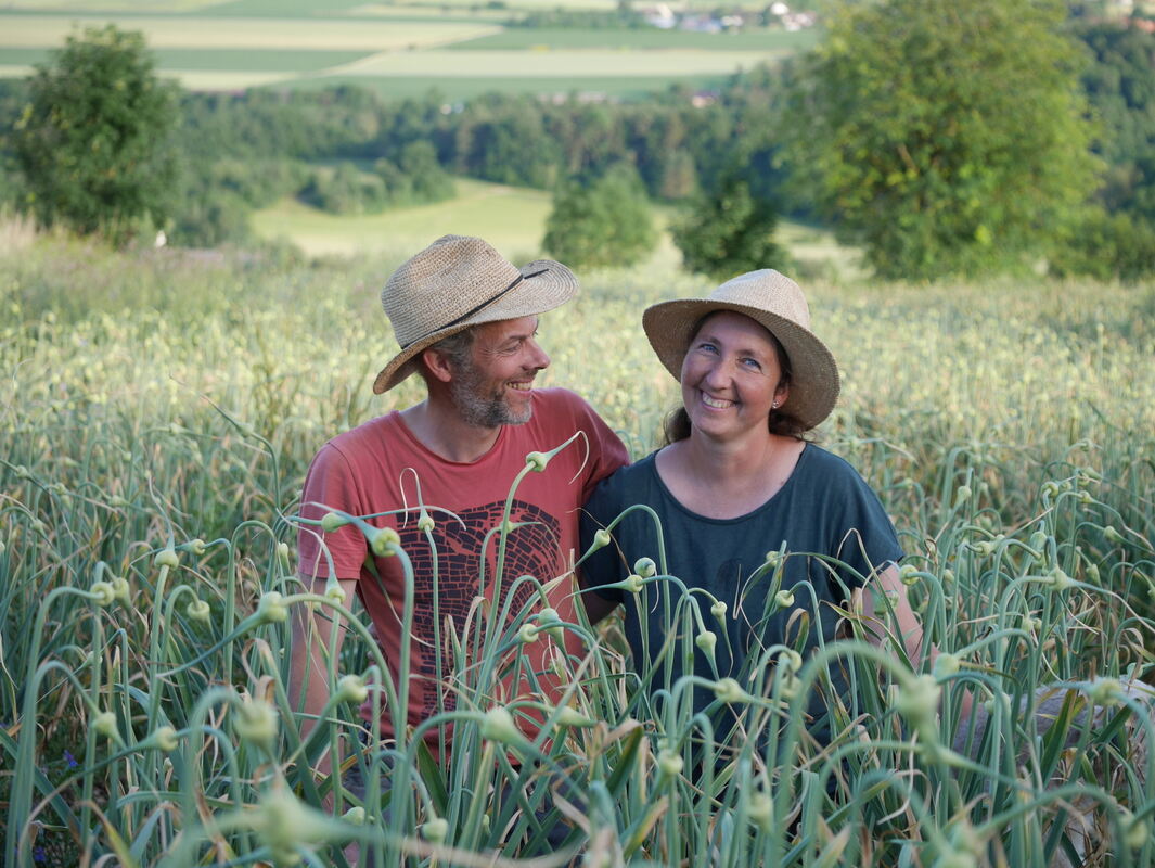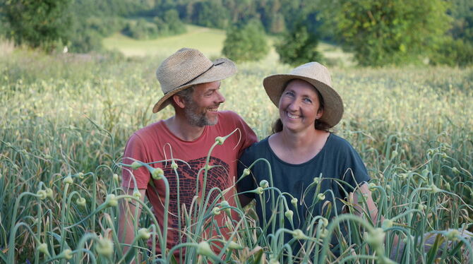 Max und Szilvi Mammel beweisen, dass Knoblauch auf der Alb prächtig gedeiht.