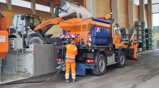 Fest und flüssig: Die Streufahrzeuge werden mit Salz in zwei Aggregatzuständen befüllt.