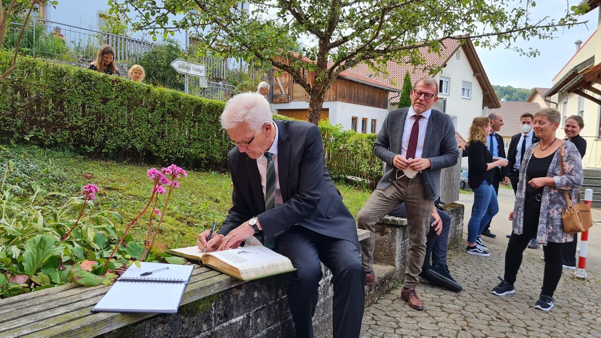 Winfried Kretschmann trägt sich ins Goldene Buch der Stadt Münsingen ein. Der Politiker Erzberger ist für ihn auch ein Beispiel für Mut und Zivilcourage.