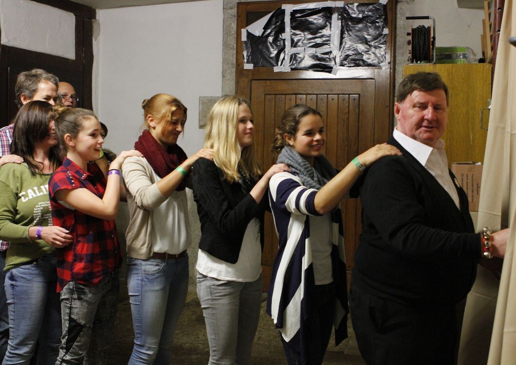 An der Schulter gefasst und im Gleichschritt mit Roland Wahl ins Dunkelrestaurant.