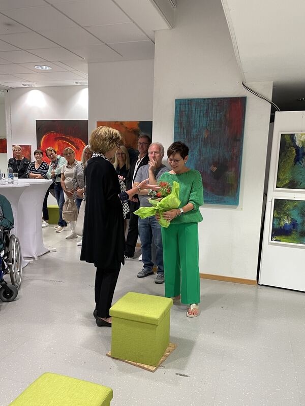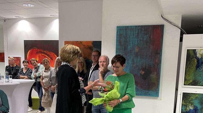 Angetrieben von der Lust am Gestalten und Ausprobieren, hat Ingeborg Siegler-Harrer ihre ganz eigene künstlerische Sprache entwickelt. Bei der gut besuchten Ausstellungseröffnung am Montagabend zeichnete Uwe Reutter in seiner Einführung diese Entwicklung nach. Die Münsinger Künstlerin hat dabei förmlich aufgesaugt, was in verschiedenen Kursen zu lernen war. Wissen und Können ist das eine, Neugier und Kreativität das andere – davon bringt Ingeborg Siegler-Harrer selbst jede Menge mit. Mit ebenso viel Spontaneität wie kritischer Beharrlichkeit gestaltet sie Kunst, die mit leichter Hand gemalt wirkt, tatsächlich aber sorgfältig durchkomponiert ist.