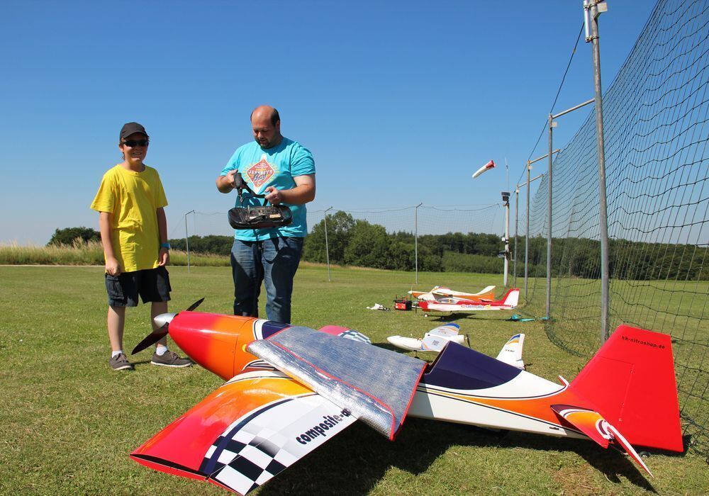 Für das große Kunstflug-Modell »Extra 330« muss Flugschüler Fabrice noch ein bisschen üben. Zusammen mit seinem Lehrer Jonathan Droemer fliegt er bisher das dahinter geparkte Styropor-Maschinchen, das eine etwas härtere Landung eher verzeiht.