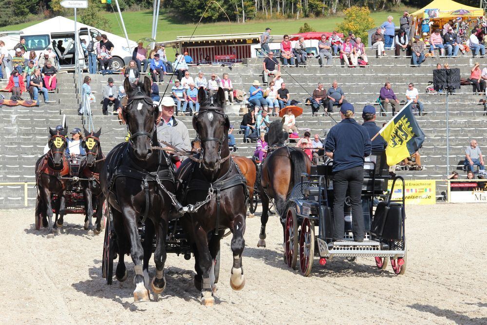 Fahrkunst in Vollendung zeigen 16 Gespannfahrer aus ganz Baden-Württemberg in der großen Zweispänner-Quadrille. GEA-FOTO: GEIGER