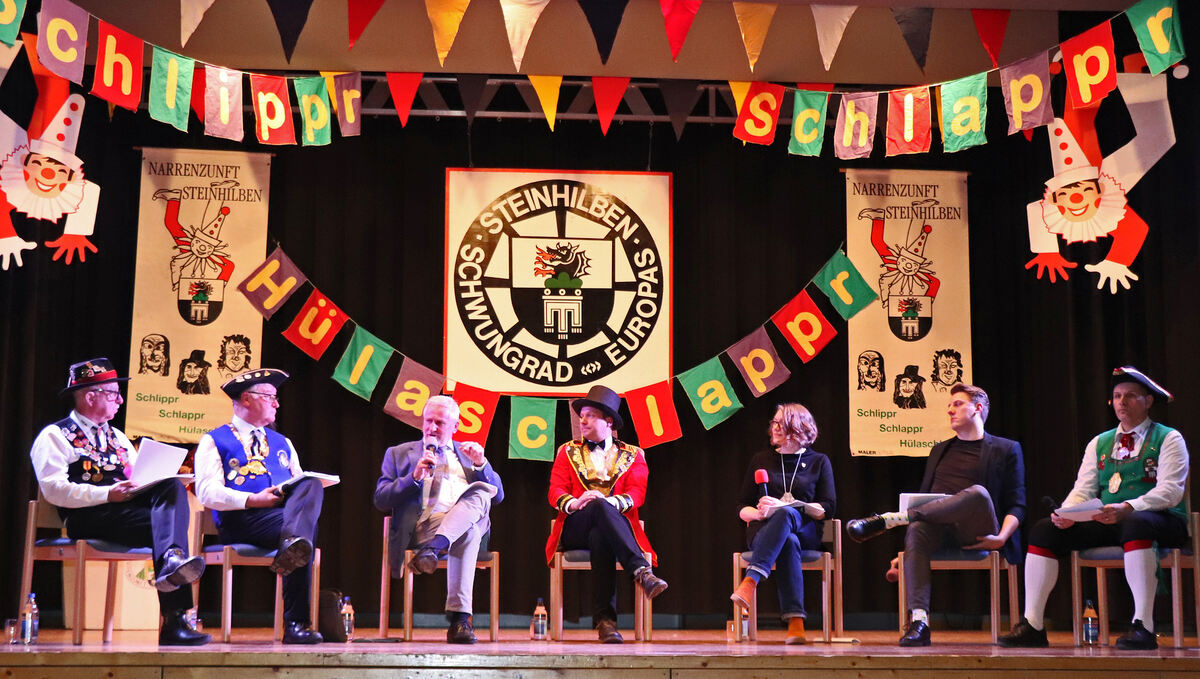 Teilnehmer der Podiumsdiskussion waren: von links: Reinhard Siegle (VFON), Kurt Szofer (Narrenfreundschaftsring Schwarzwald-Baar-Heuberg), Staatssekretär Thomas Blenke, Landtagsabgeordneter Manuel Hailfinger, Bürgermeisterin Katja Fischer, Niklas Barnstorf (Landratsamt Reutlingen), Zunftmeister Marc Hazotte.