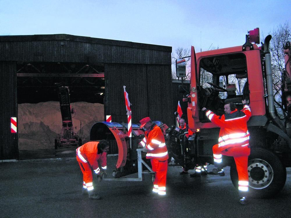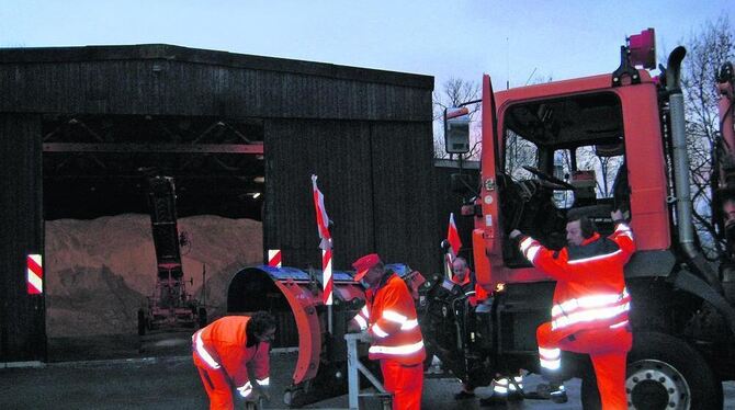 In der Dunkelheit machen sich die Leute von der Straßenmeisterei Eningen vor der Salzhalle auf zur nächsten Runde.