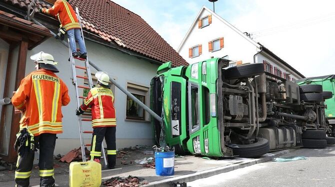 PFRONSTETTEN. Der Fahrer eines mit etwa 75 Kubikmeter Sägemehl beladenen Vierzigtonners aus dem Landkreis Ravensburg ist am Freitagmorgen, gegen neun Uhr, in der Ortsdurchfahrt von Pfronstetten schwer verunglückt.