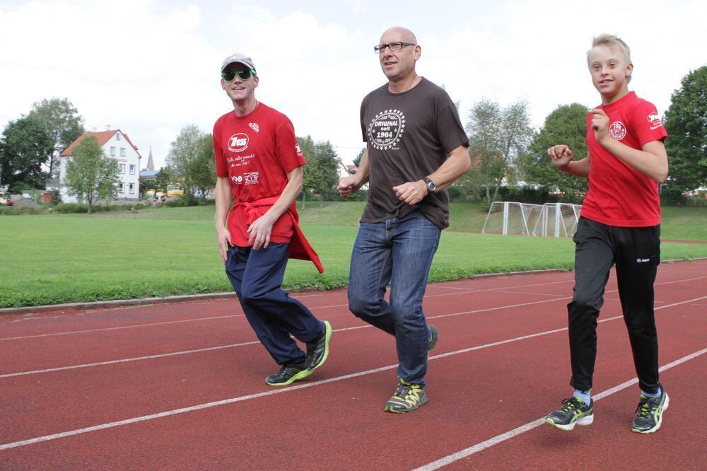 Einfach loslaufen, Spaß haben, über sich hinaus wachsen: Bei der TSG Münsingen wird Inklusion gelebt. André Hallmanns (links) und Luis Buck (rechts) sind trotz Handicap gleichwertige Mitglieder im Lauftreff um Trainer Hartmut Rauscher. FOTO: SCHRADE