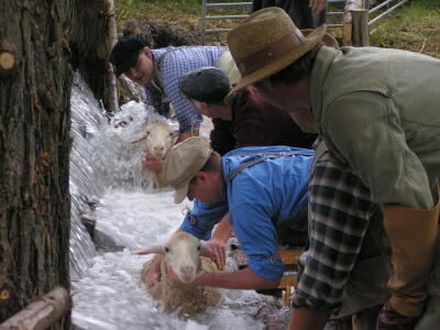 GOMADINGEN-WASSERSTETTEN. Entrinnen unmöglich. Zu viele Schaulustige hatten sich am Sonntag am Ufer der Lauter dicht bei dicht versammelt, um das Spektakel ganz nah miterleben zu können. Die Schafwäsche, wie vor sechzig Jahren in Wasserstetten als Handwerk betrieben und bis weit hinaus ins Land bekannt. Vor allem wegen des wohltuenden Wassers der Lauter für die Schafwolle, wie es heißt. Die Pelze der Merinos sollen, rückengewaschen, noch mehr Wert gehabt haben, als die der sonst irgendwo im Land gebadeten Schafe.