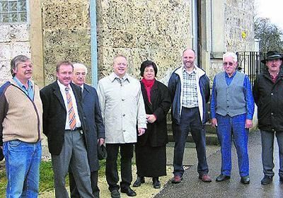 Das Komitee zur Erhaltung der Kirche in Gruorn vor dem alten Schulhaus des zerstörten Dorfes, von links: Rolf Blochinger, Hans Lamparter, Adam Goller, Siegfried Fischer, Margarethe Brändle, Erhard Holzschuh, Walter Eckhardt, Hans-Michael Kehm.