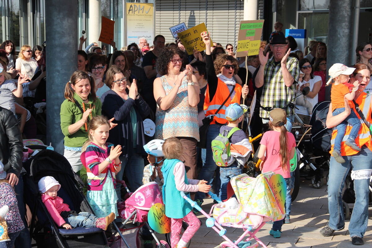 »Geboren in Münsingen«: Plakate klebten an Kinderwagen, wurden auf Schildern in die Höhe gereckt. »Geboren in?« oder »Hoffentlich…geboren in Münsingen« hatte schwangere Frauen auf ihre T-Shirts geschrieben. Kinderrasseln wurden geschwenkt, La-Ola-Wellen weitergetragen.