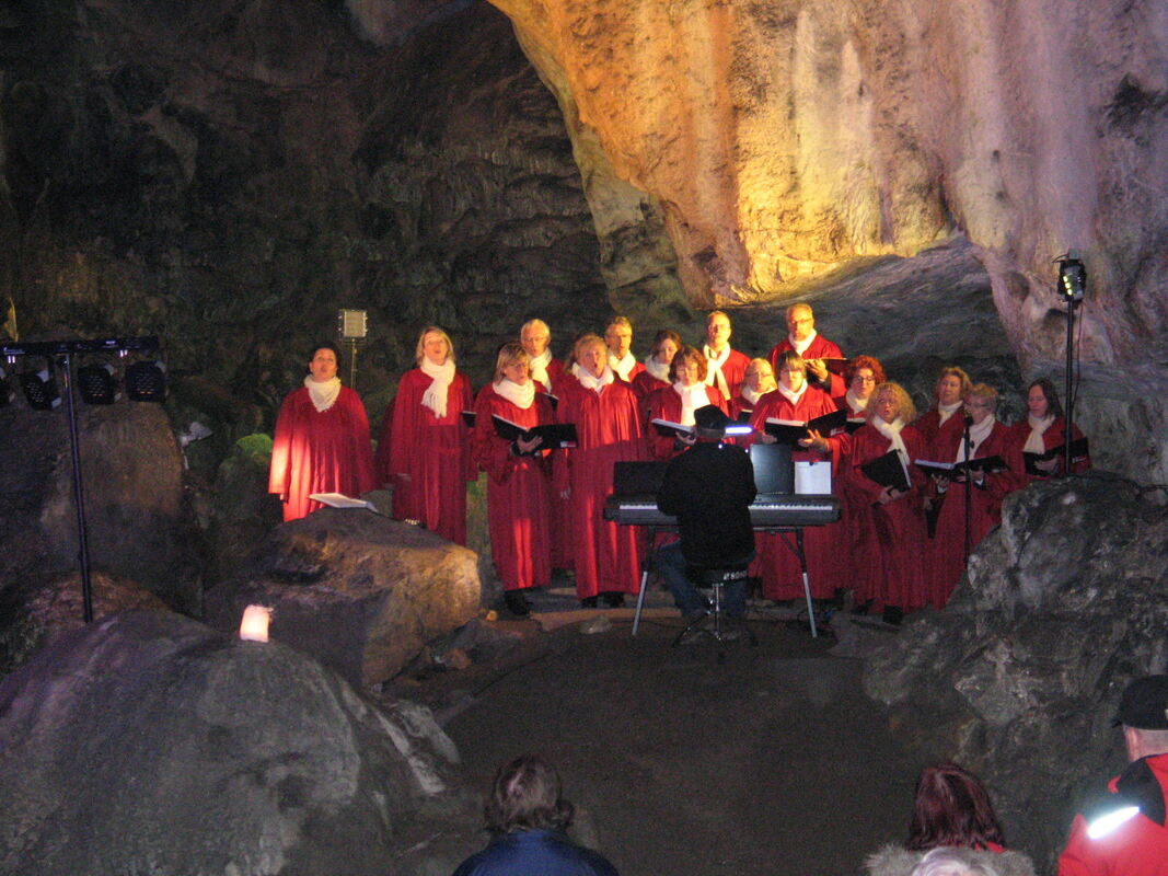 SONNENBÜHL. Der »Gospeltrain Willmandingen« machte am Samstagabend in der Genkinger Nebelhöhle Halt. Bei ihrem gefühlvollen und mitreißenden Konzert inmitten der beeindruckenden Kulisse der Tropfsteinhöhle rund vierzig Meter unter der Oberfläche und fast 800 Meter tief im Erdinneren zeigten die leidenschaftlichen Sänger und Sängerinnen des Gospelchors unter der Leitung von Helmut Hauber, dass auch der Klang der Gospels ganz tief unter die Haut gehen kann.