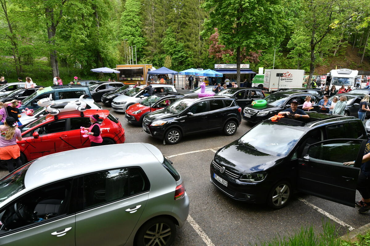 Der Clou an der Malle-Party: Die Hälfte der Gäste kam wie beim Drive-in-Kino-Besuch mit dem Auto. Sie mussten im oder am Fahrzeug bleiben, Maskenpflicht beim Verlassen des Autos und beim Gang zu den Verpflegungsständen oder aufs Freibad-WC. Die andere Hälfte durfte an der Zufahrt zum abgesperrten Festareal eine Schnelltest durch eine medizinische Fachkraft über sich ergehen lassen. Im negativen Ergebnisfall gabs Einlass zu einem der zwanzig »Biertischkäfige«. Innerhalb der zu Vierecken zusammen gestellten Garnituren entstanden kleine Feierinseln für Cliquen. Auf der Bühne heizten DJ Brause und die Party-Sänger Micha Rampe sowie Matty Valentino pausenlos ein. (GEA)