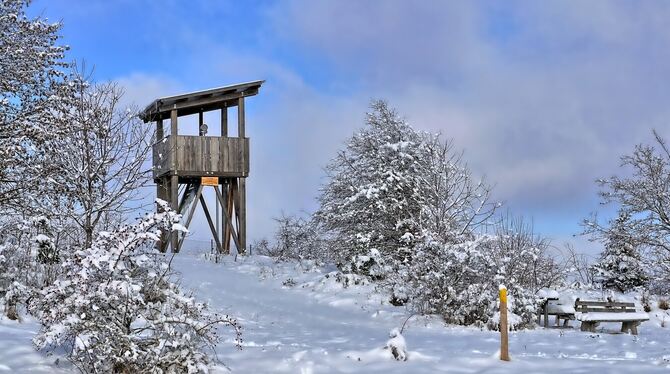MÜNSINGEN. Bei herrlichem Winterwetter waren auch am vergangenen Wochenende wieder viele Wanderer auf einem der 13 freigegebenen Wege über den ehemaligen Truppenübungsplatz unterwegs. Wer einen der drei ehemaligen Beobachtungstürme der Bundeswehr besteigen wollte, hatte allerdings Pech. Sie sind »coronabedingt seit Anfang November 2020 geschlossen und bis auf Weiteres nicht mehr frei zugänglich«, teilt die Touristik Information Münsingen auf Anfrage mit. Wann die stählernen Kolosse Hursch (42 Meter), Heroldstatt (30 Meter) und Waldgreut (20 Meter) wieder geöffnet werden, ist ungewiss. Das gilt auch für den acht Meter hohen Sternenberg-Turm, der ebenfalls zu ist.