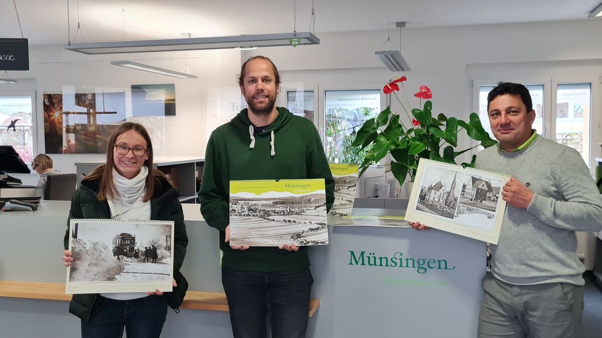 Stadtarchivarin Carina Zeiler, Kulturamtleiter Yannik Krebs und Tourismus-Chef Hans-Peter Engelhart präsentieren den neuen Münsinger Kalender.