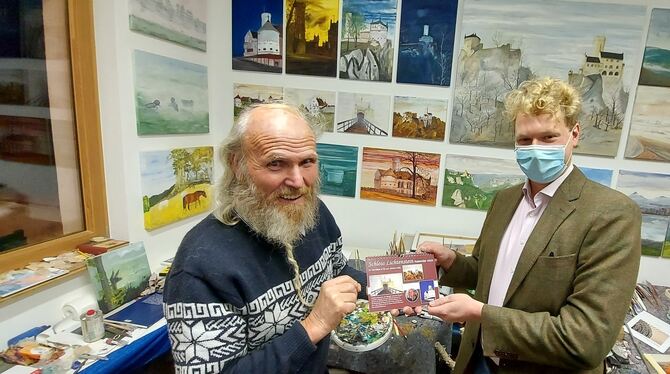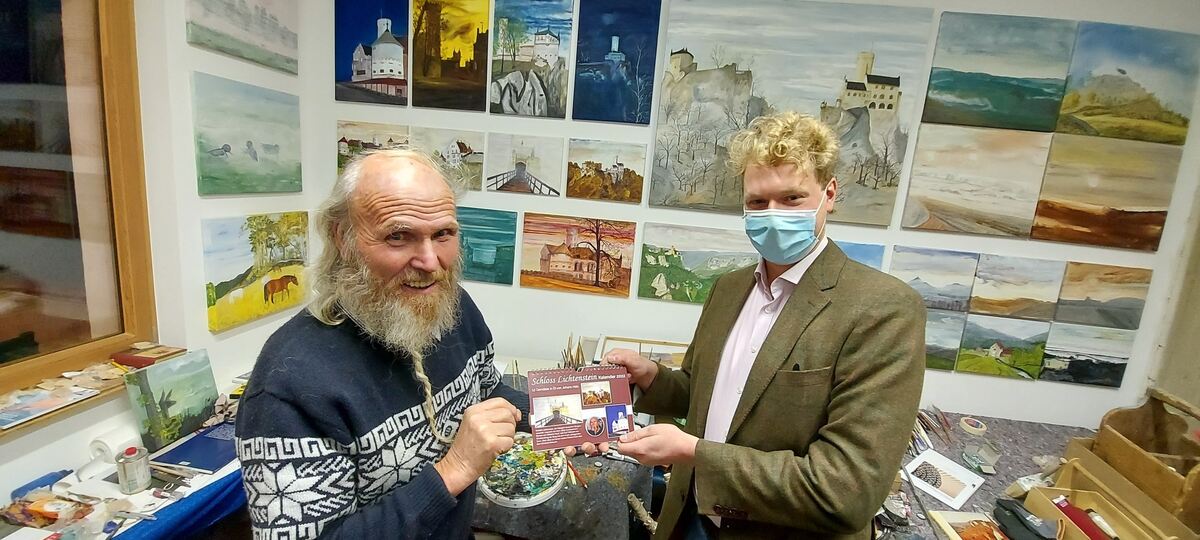 Als Tourismusministerin Dr. Nicole Hoffmeister-Kraut im Oktober Schloss Lichtenstein besuchte, hat sie ein erstes Exemplar von Hölz’ Lichtenstein-Kalender erhalten. Fürst Karl Philipp von Urach kam nun auf Vermittlung des Sonnenbühler CDU-Landtagsabgeordneten Manuel Hailfinger zu einem Besuch nach Undingen. Er wollte sehen, wo die Gemälde von seinem Schloss hängen. Neben einem Kalender schenkte Johann Hölz dem Fürst auch ein Bild vom Lichtenstein, das nicht darin zu sehen ist. Seine Lieblingsansichten – die auf den Blättern für September und Oktober – kann er ja in gedruckter Form betrachten. »Ich freue mich, dass Sie sich für das Schloss begeistern«, sagt von Urach. Und machte noch ein Angebot, nachdem der Kontakt zwischen Schlossherr und Schloss-Maler nun hergestellt ist: Johann Hölz soll nach Schloss Lichtenstein kommen und im Inneren malen können oder auch auf den Turm steigen dürfen, Eindrücke und andere Perspektiven für neue Bilder rund ums Schloss sammeln.