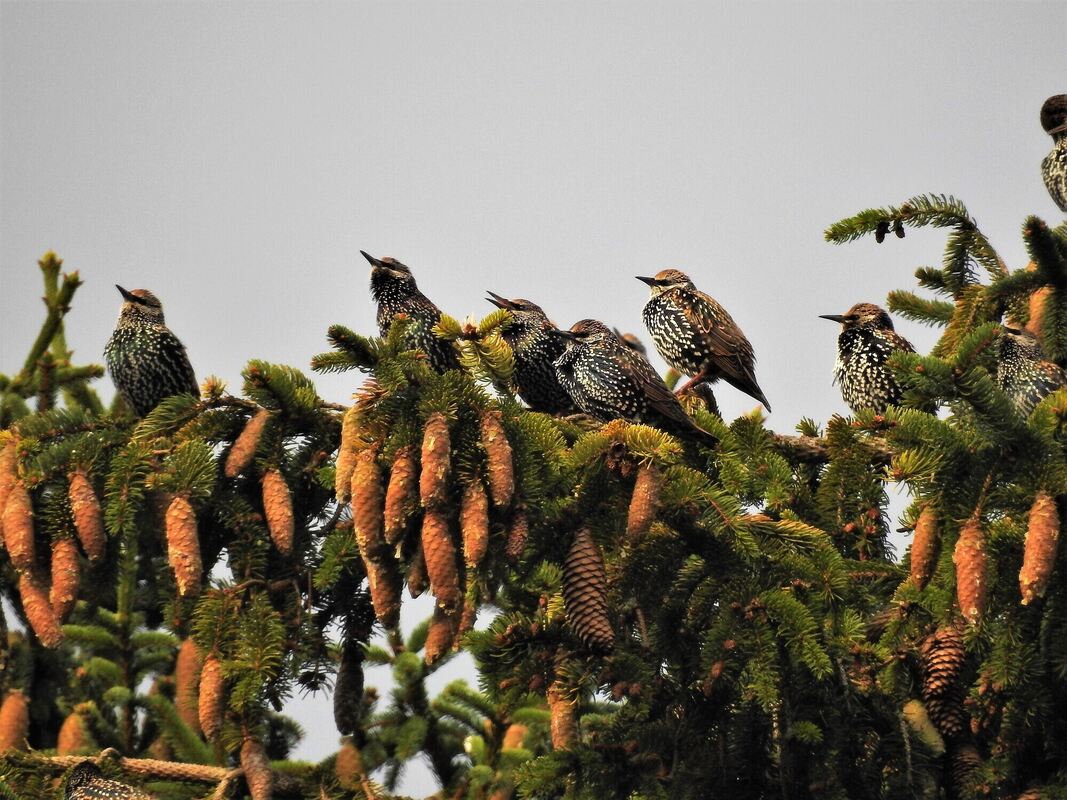 Mangels Insekten in diesem Jahr können sich die Vögel in Gärten und auf Streuobstwiesen bedienen, denn Obst steht ebenfalls auf ihrem Speiseplan. Im Herbst und Frühwinter tragen diese Vögel statt des farbig grün bis purpur schillernden Frühjahrsgefieders, des sogenannten Prachtkleids, ein mit vielen weißen Perlen übersätes Schlichtkleid. Der schwarze Kopfputz wird über den Winter matt braun. (GEA)