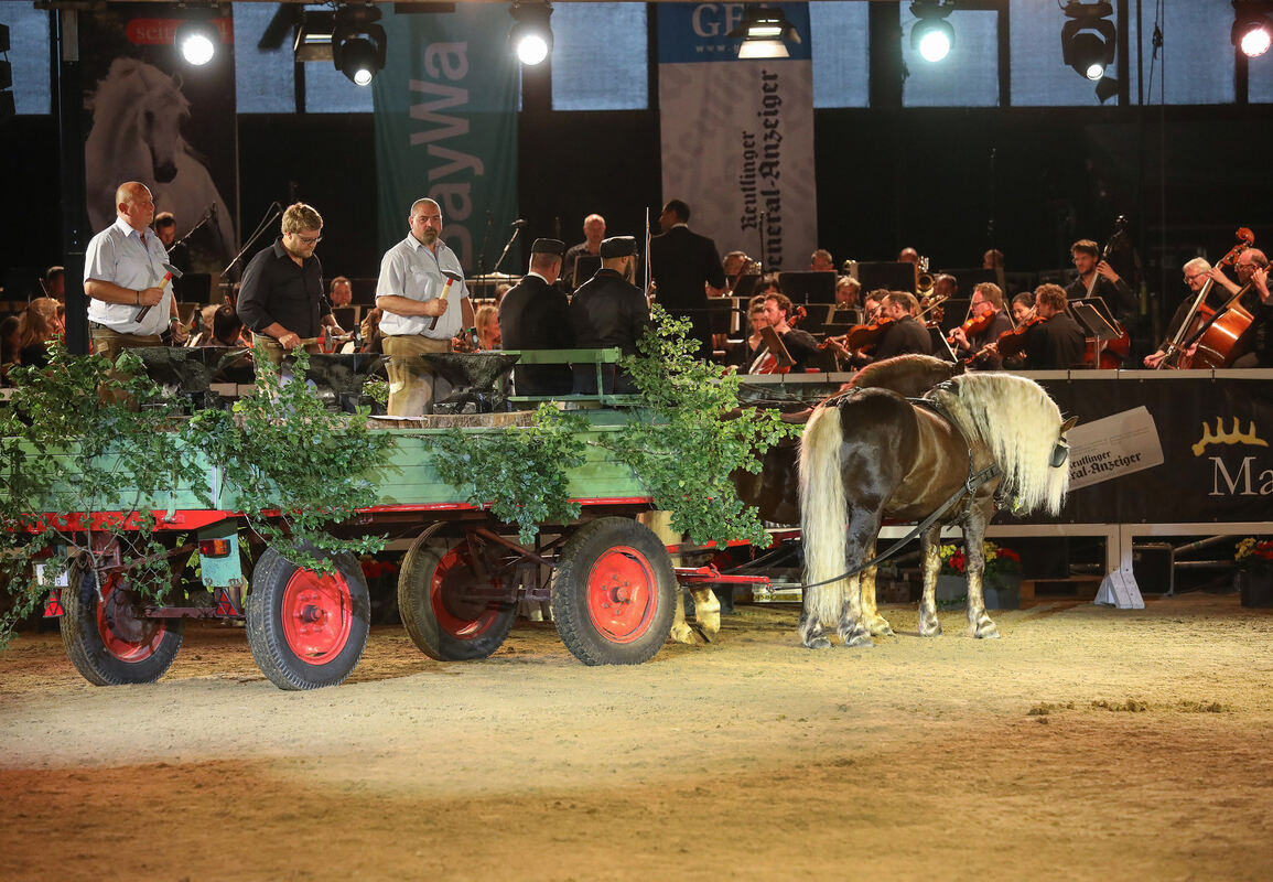 Keine Frage, es geht auch kerniger. Mit Albert Parlows »Amboss-Polka«. Da fahren sie auch schon herein, die drei Ambosse auf einem stabilen Kutschwagen. Mit veritablen Hämmern werden sie im Takt bearbeitet von drei muskulösen Mannsbildern: WPR-Schlagzeuger Markus Kurz sowie den echten Hufschmieden Michael Krehl und Stefan Jaiser. Rohe Kraft mal ganz taktvoll, möchte man sagen.