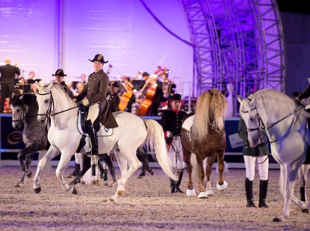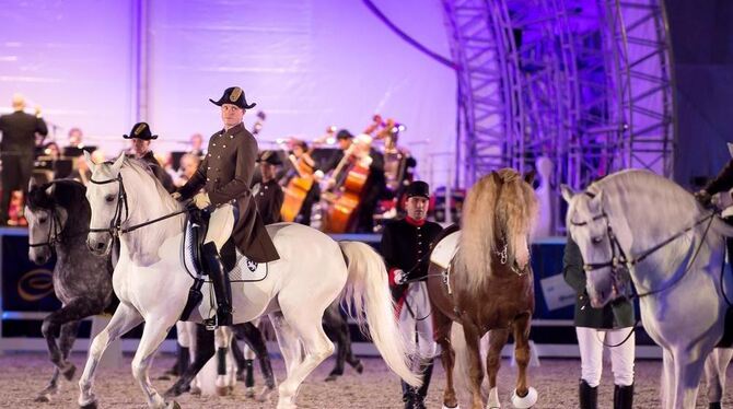Pferdeballett geritten und am Langen Zügel mit den Lipizzanern der Spanischen Hofreitschule, aus dem slowakischen Topol‘cianky und Marbacher Schwarzwäldern.