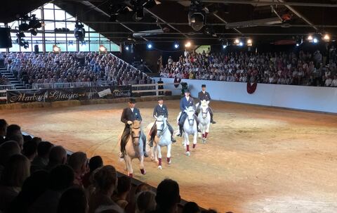 GOMADINGEN-MARBACH. Zur zehnten Auflage der Marbach Classics haben die Veranstalter – das Haupt- und Landgestüt Marbach, die Württembergische Philharmonie Reutlingen und der Reutlinger General-Anzeiger – einige der schönsten und beliebtesten Schaunummern in einem Programm vereint. Der französische Tier-Comedian Guillaume Assire-Becar gehörte ebenso dazu wie die festliche Dressur-Quadrille Marbacher Hengste. Und auch der Marbach-Klassiker schlechthin – die Silberne Herde – durfte nicht fehlen: Wunderschön ist die schwebende Eleganz der Araberstuten immer, aber nie so überirdisch wie im blauen Scheinwerferlicht.