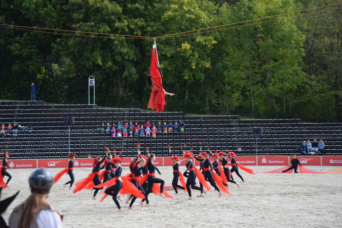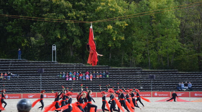Don Quijotes angebetete Dulcinea, alias Ana Ayromlou, schwebt auf den Marbacher Hengstparadenplatz ein. Die Tanzschüler von Gitte Wax gestalten das bunte Bild mit. foto: geiger