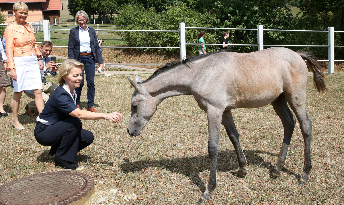 Ursula von der Leyen – links Friedlinde Gurr Hirsch, rechts Astrid von Velsen-Zerweck – ist begeistert von den Araberfohlen und dem Hengst Hochfein (rechts). FOTOS: DPA/WARNACK