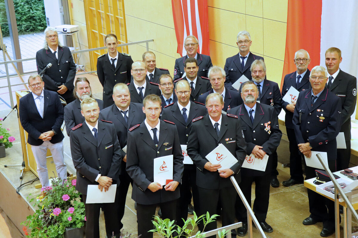 Zahlreiche Feuerwehrleute aus Münsingen und den Teilorten sind im Rahmen der Hauptversammlung geehrt worden. FOTO: BLOCHING