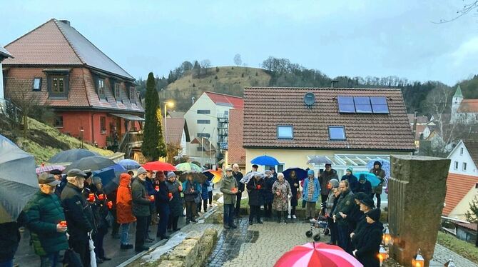 Trotz des Regens nahmen viele Menschen an der Gedenkfeier am Platz der Synagoge in Buttenhausen teil. FOTOS: HOLDER