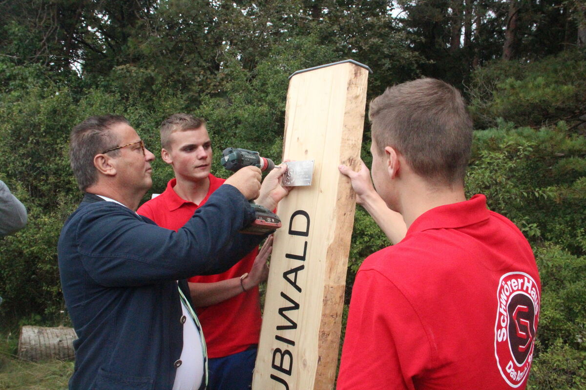 Minister Peter Hauk schraubt seine Patenschafts-Plakette an die Eingangsstele des Schwörer-Azubi-Walds bei Oberstetten.