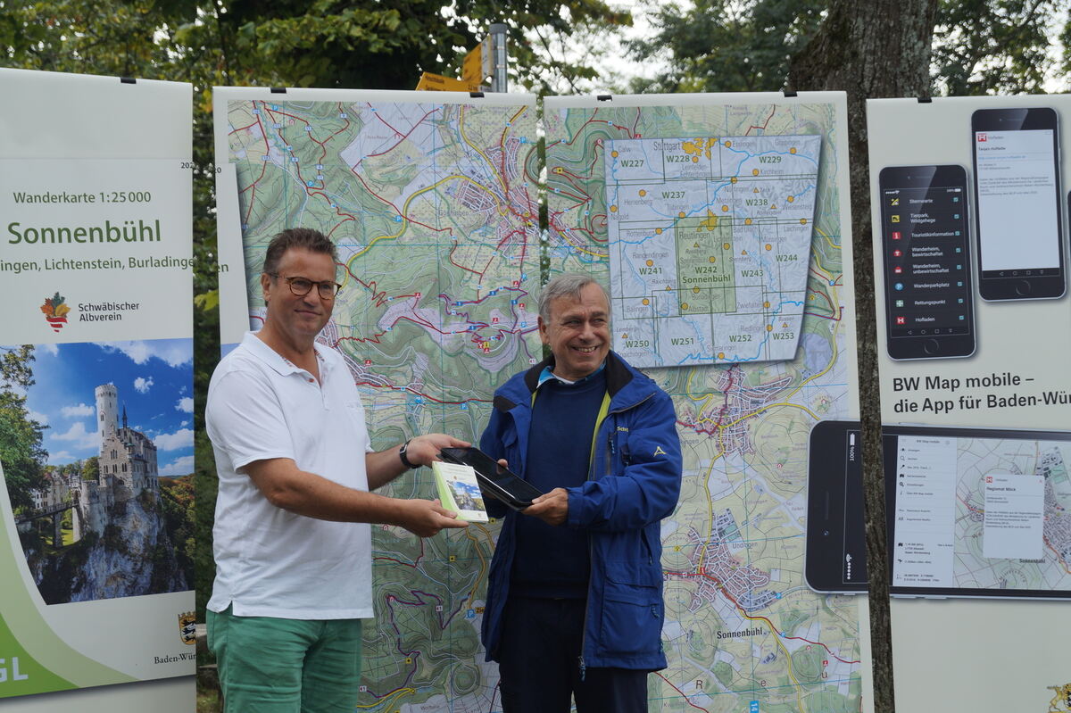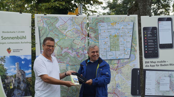 Peter Hauk (links) und Hans-Ulrich Rauchfuß stellen die neue Wanderkarte Sonnenbühl und die Wander-App-BW Map mobile vor. FOTO: WURSTER