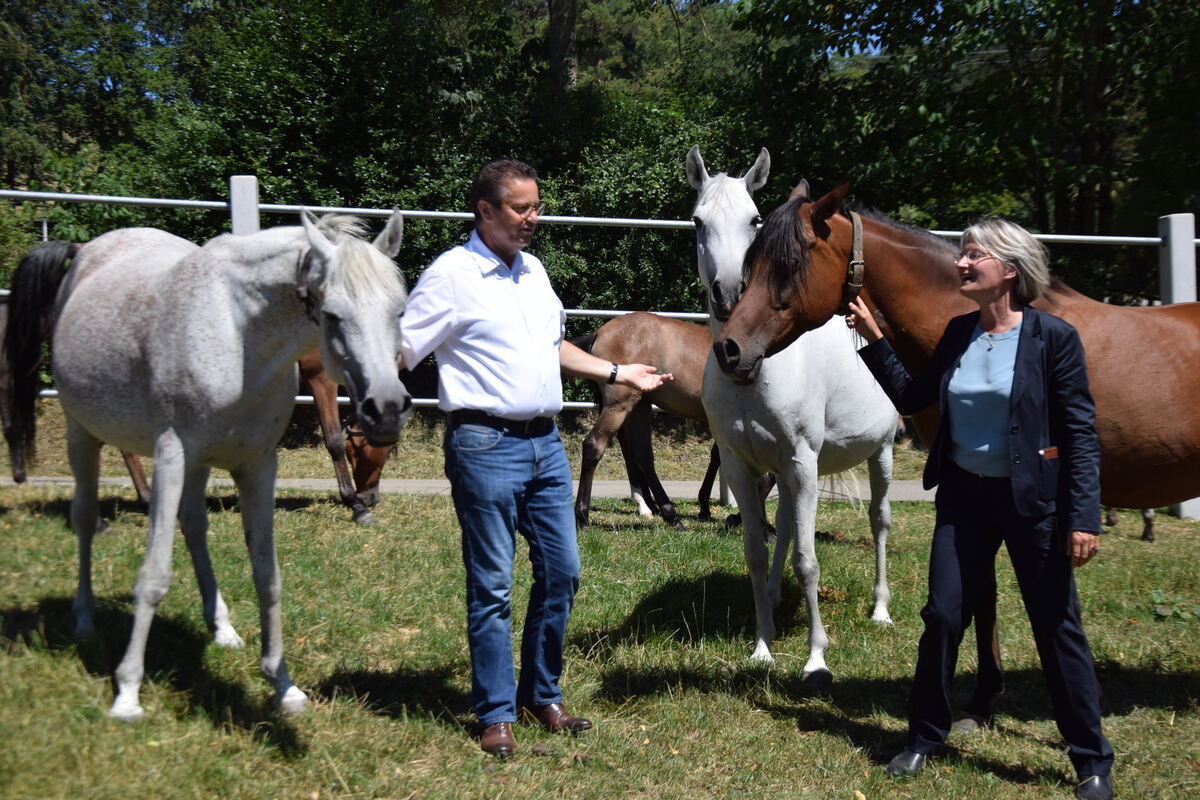 MÜNSINGEN. Peter Hauk, Landesminister für Ländlichen Raum und Verbraucherschutz und als solcher auch für alles zuständig, was in Baden-Württembergs Ställen gackert, muht und wiehert, hat gestern dem Haupt- und Landgestüt Marbach seinen Besuch abgestattet. Zuallererst um sich zu erkundigen, wie »seine« Mitarbeiter die Herausforderungen der zurückliegenden Monate gemeistert haben. Der Minister zeigte sich erleichtert, dass im Gestüt keine Coronafälle aufgetreten sind: »Ein positiver Fall hätte zu Quarantänemaßnahmen geführt, die die Betreuung und Versorgung der Tiere hätten gefährden können.«
