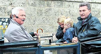 Kutschfahrt (von links) Dr. Helmut Gebhardt mit Ehefrau Birgit und Gästen Inken, Alexander und Günther Oettinger.